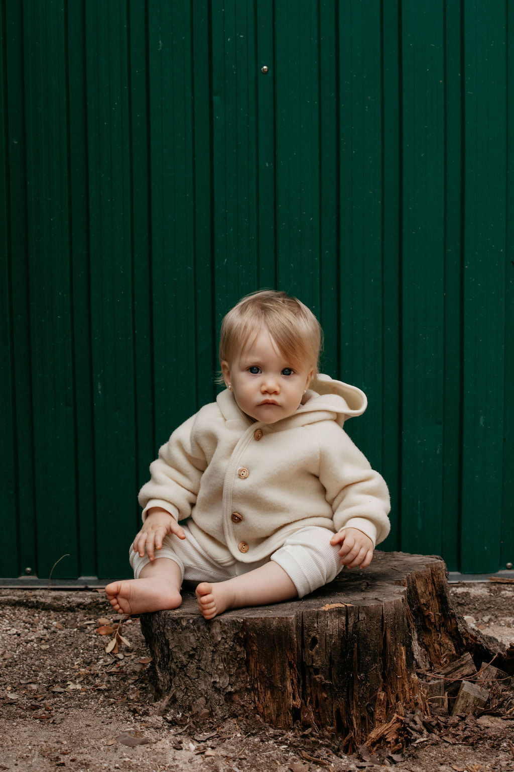 Chaqueta de 100% lana virgen orgánica (certificación IVN BEST), suave, transpirable y naturalmente termorreguladora.