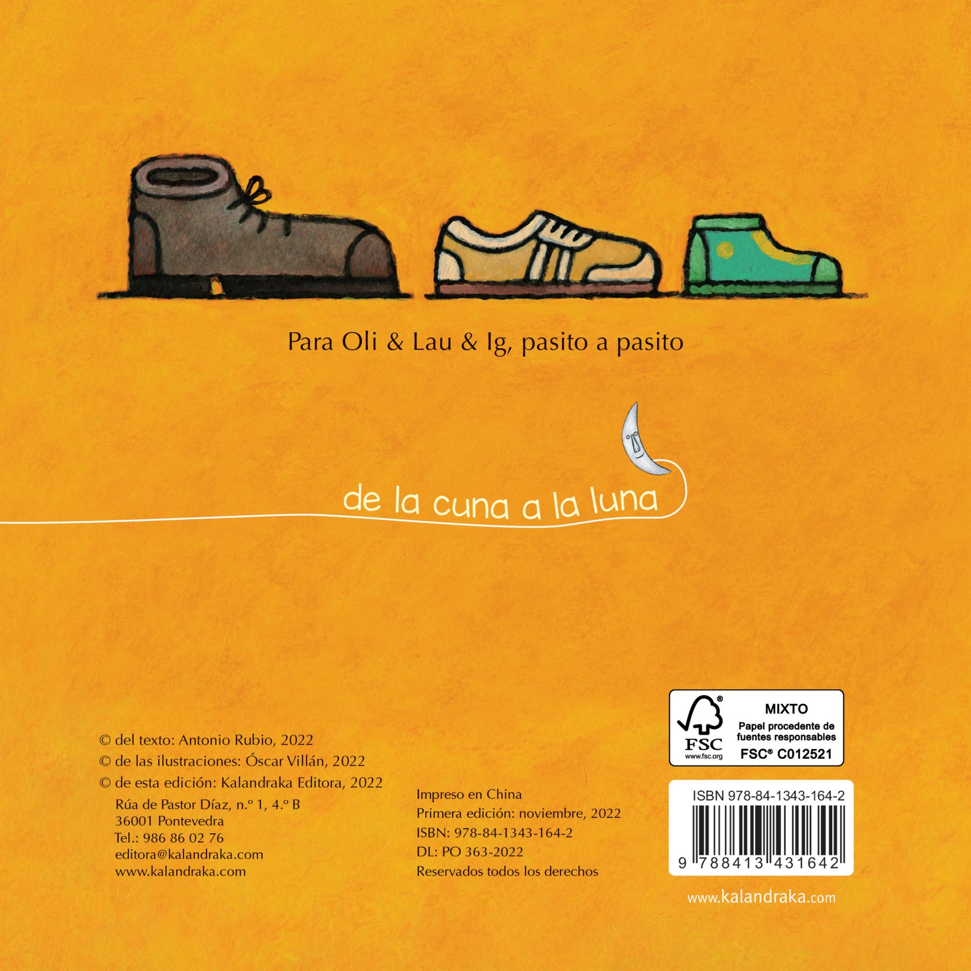 La colección De la cuna a la luna está dirigida a niñas y niños de 0 a 3 años, para quienes se han diseñado especialmente estos pictogramas poéticos o poegramas; un término acuñado para designar una modalidad de poesía pictográfica basada en la búsqueda de un ritmo de lectura que ayude a “educar el ojo y endulzar el oído” del pequeño lector, como explica Antonio Rubio. Óscar Villán -Premio Nacional de Ilustración 1999- ha elaborado la propuesta estética de estos doce libros. Su trabajo es totalmente artesanal, con pinceladas y tonalidades de color fácilmente.