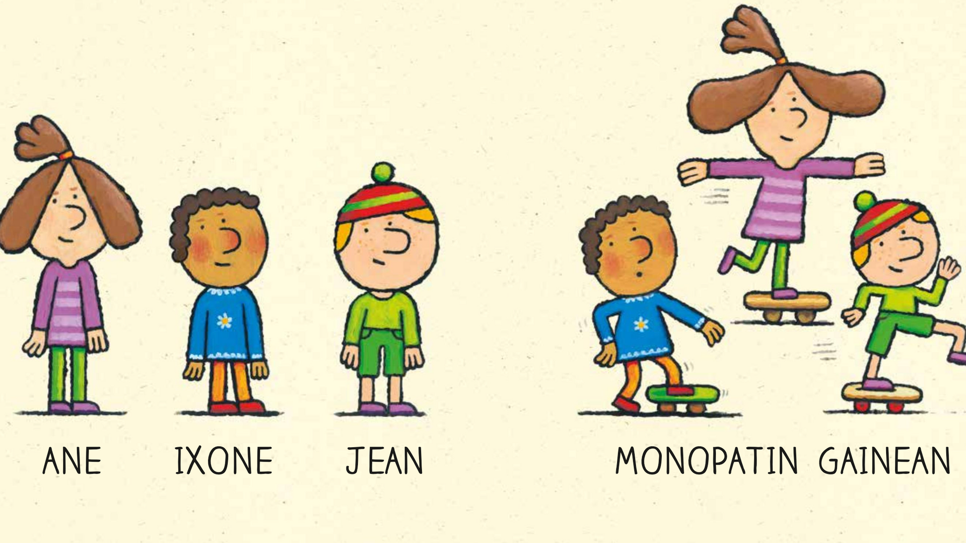 Niñas y niños de distintas edades y culturas -un guiño a la diversidad- se desplazan en medios de locomoción individuales y colectivos tanto para jugar como para llegar a otros lugares: monopatín, bicicleta, automóvil…